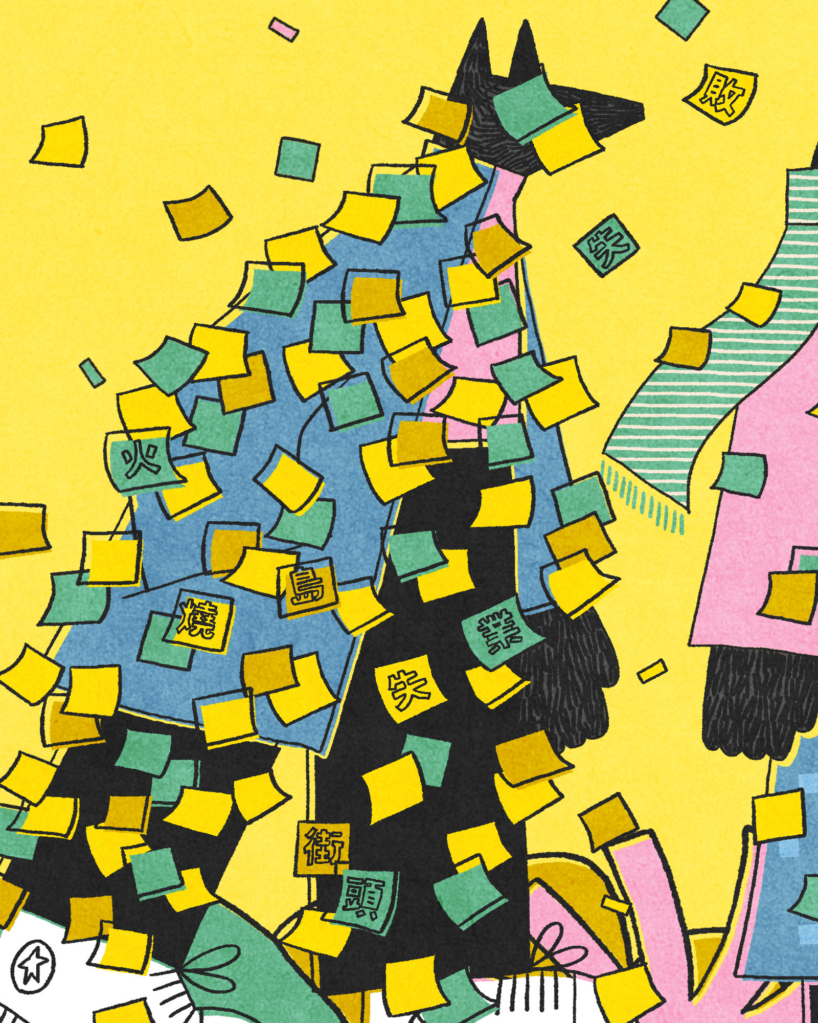 The visual narrative flows from left to right: beginning with a person covered in labels, which gradually float away and transform into ribbons. The scene then transitions to people seated at a round table sharing a meal, while the words from the labels drift onto the dining table. This is a space where stories can be freely shared and heard.